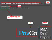 | 22:33, 11 May 2016 | PrivCo-Merger-AcquisitionReport.jpg (file) | 113 KB | Wiki-admin | Screen capture of the front of an M&A report by PrivCo with key citation elements labelled. | 1 | |